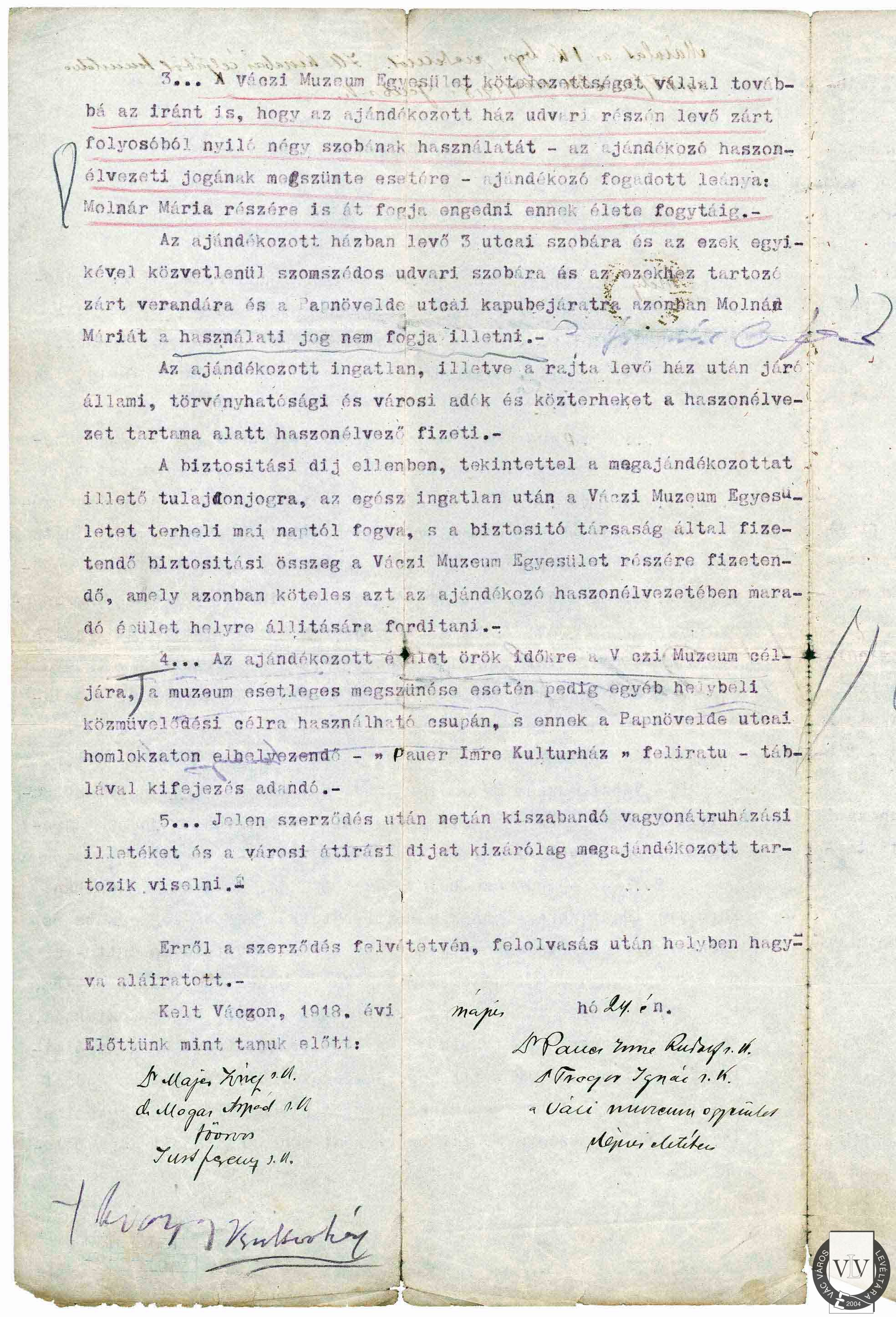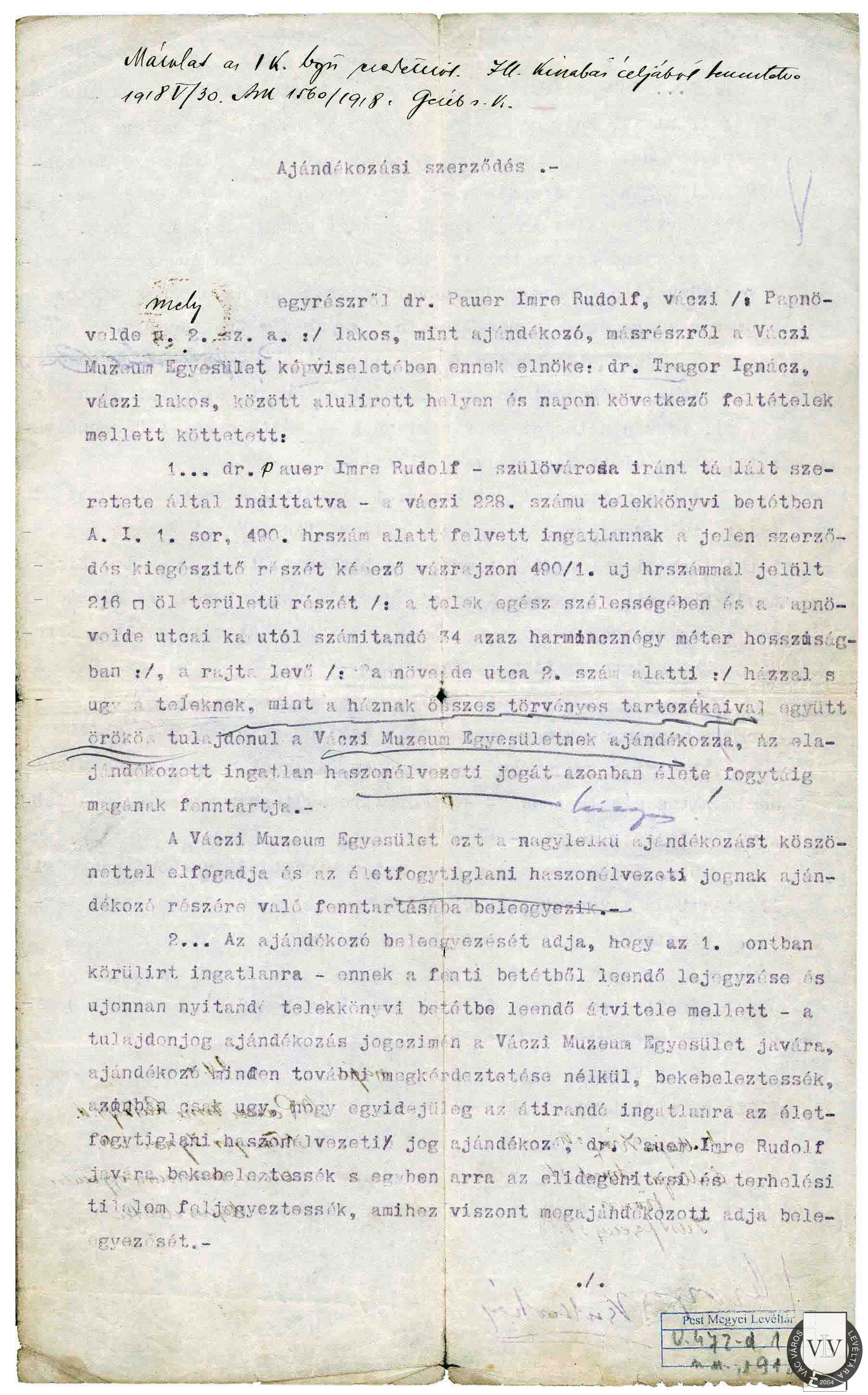 Pauer Imre ajándékozási szerződése, 1918
