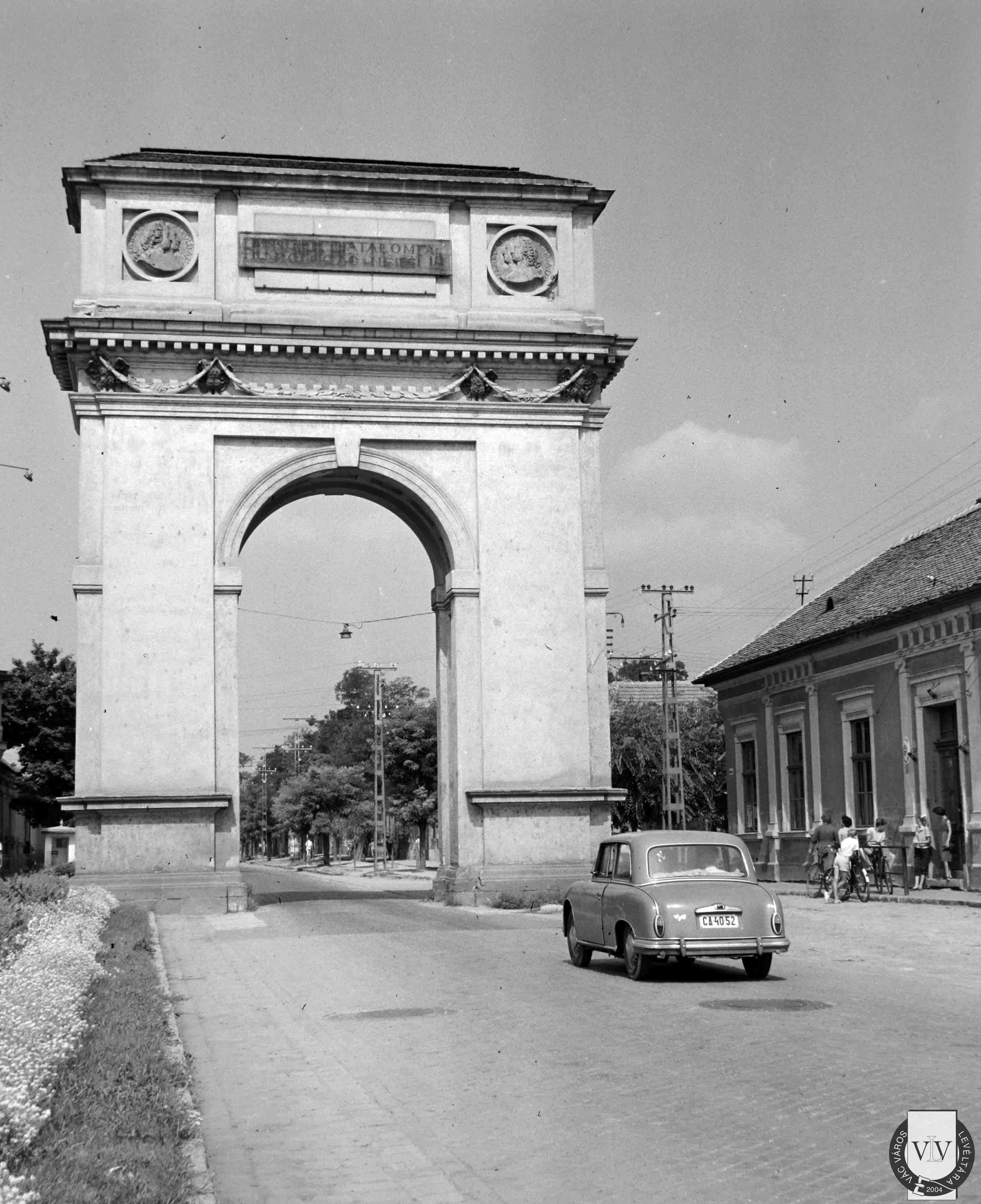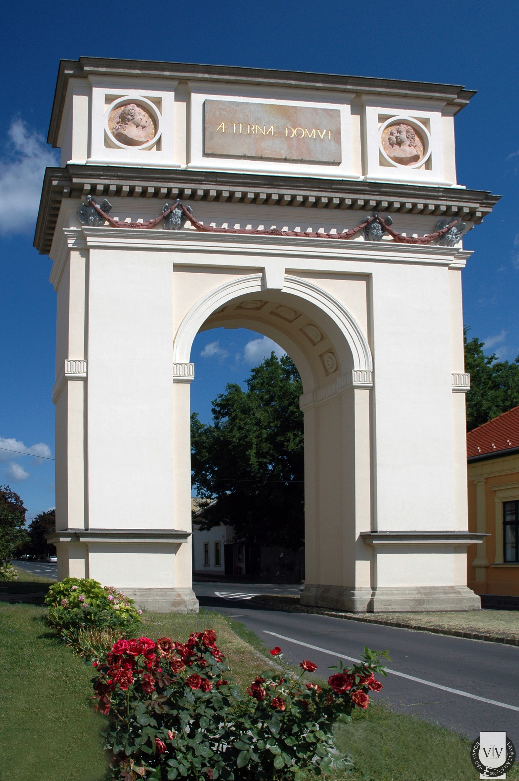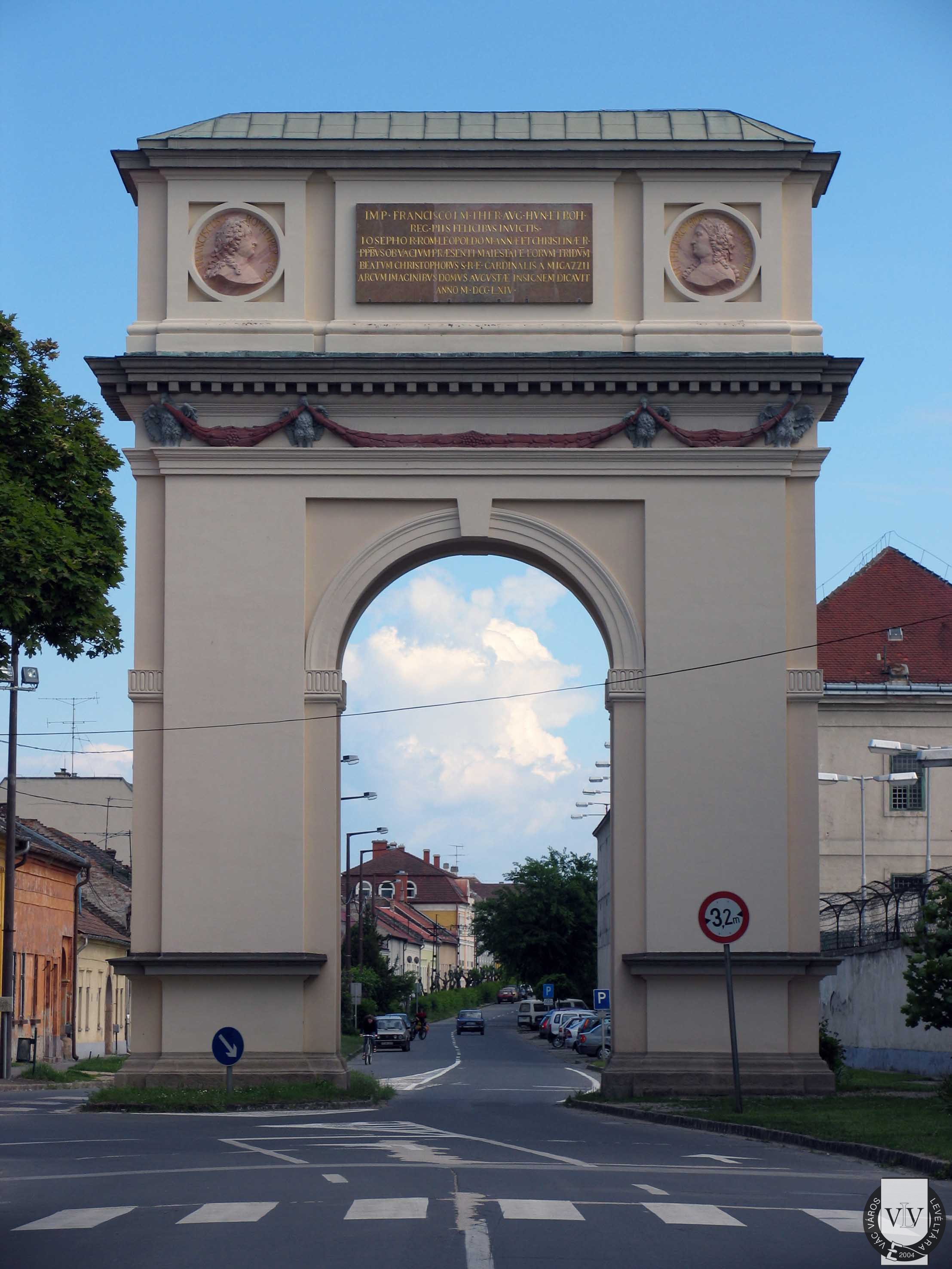 A Kőkapu északi homlokzata (A tábla feliratának fordítása: A fenséges I. Ferenc római császár és Mária Terézia, Magyarország és Csehország boldog és kegyes királya, József győzedelmes római király, Lipót és Anna és Krisztina királyi hercegek háromnapi szerencsés váci tartózkodására emelte e diadalívet a császári háznak Migazzi Kristóf kardinális 1764-ben