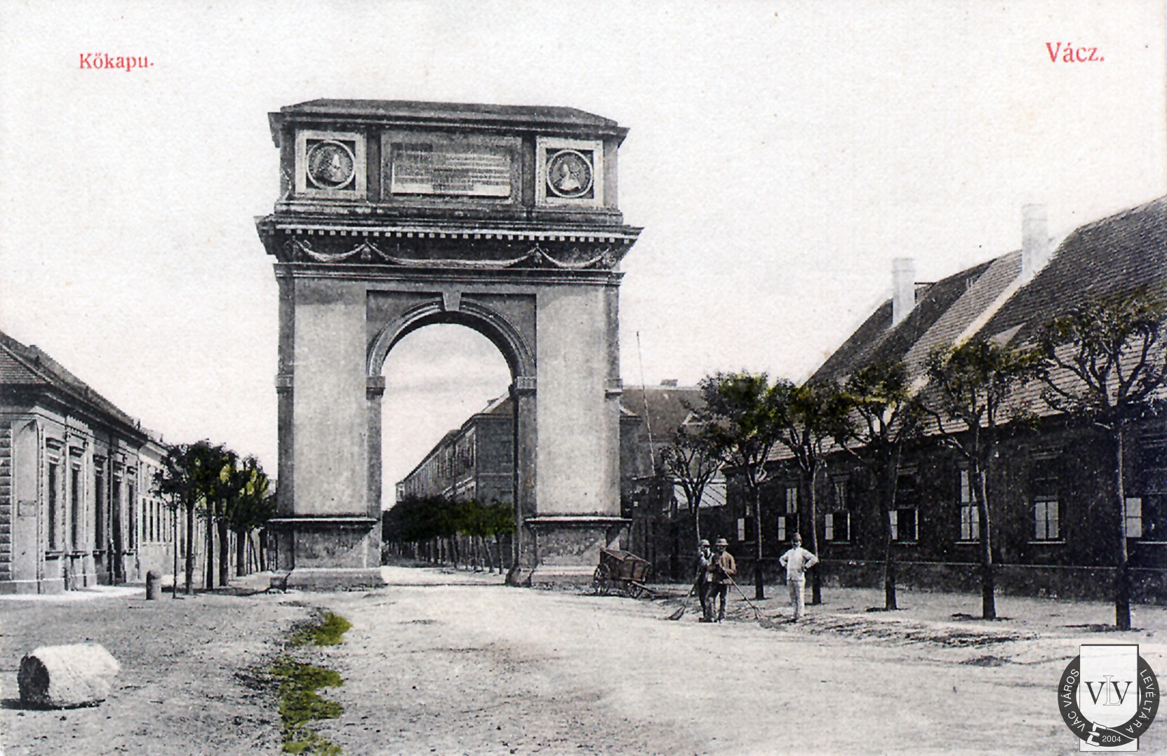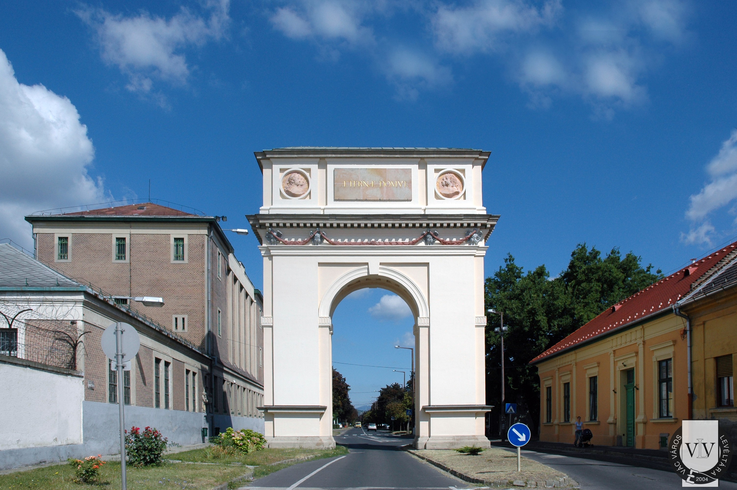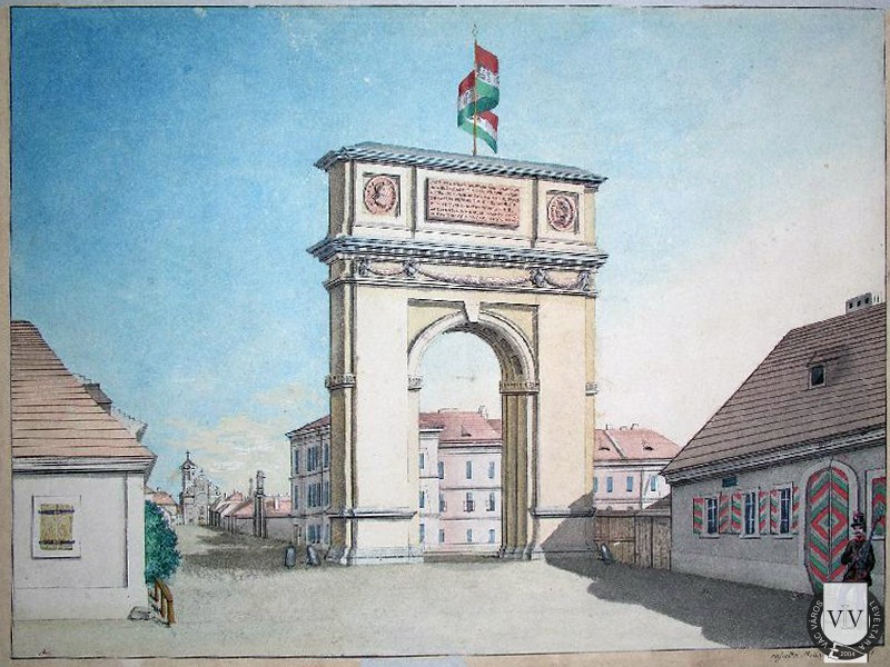 A Kőkapu északi homlokzata (A tábla feliratának fordítása: A fenséges I. Ferenc római császár és Mária Terézia, Magyarország és Csehország boldog és kegyes királya, József győzedelmes római király, Lipót és Anna és Krisztina királyi hercegek háromnapi szerencsés váci tartózkodására emelte e diadalívet a császári háznak Migazzi Kristóf kardinális 1764-ben