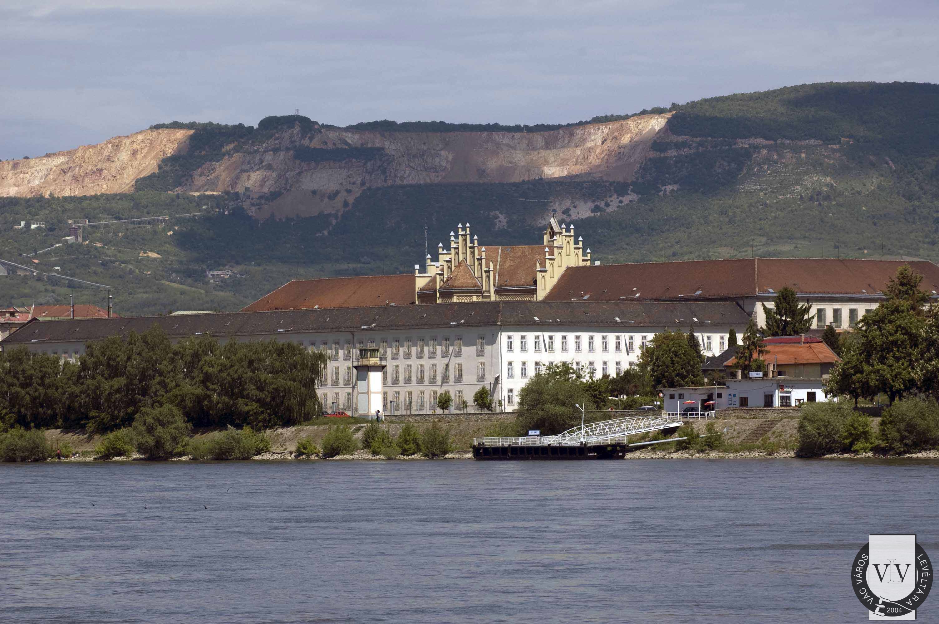 A fegyház a neogótikus kápolnával, A Dunán hajómalmokkal, 1870-es évek