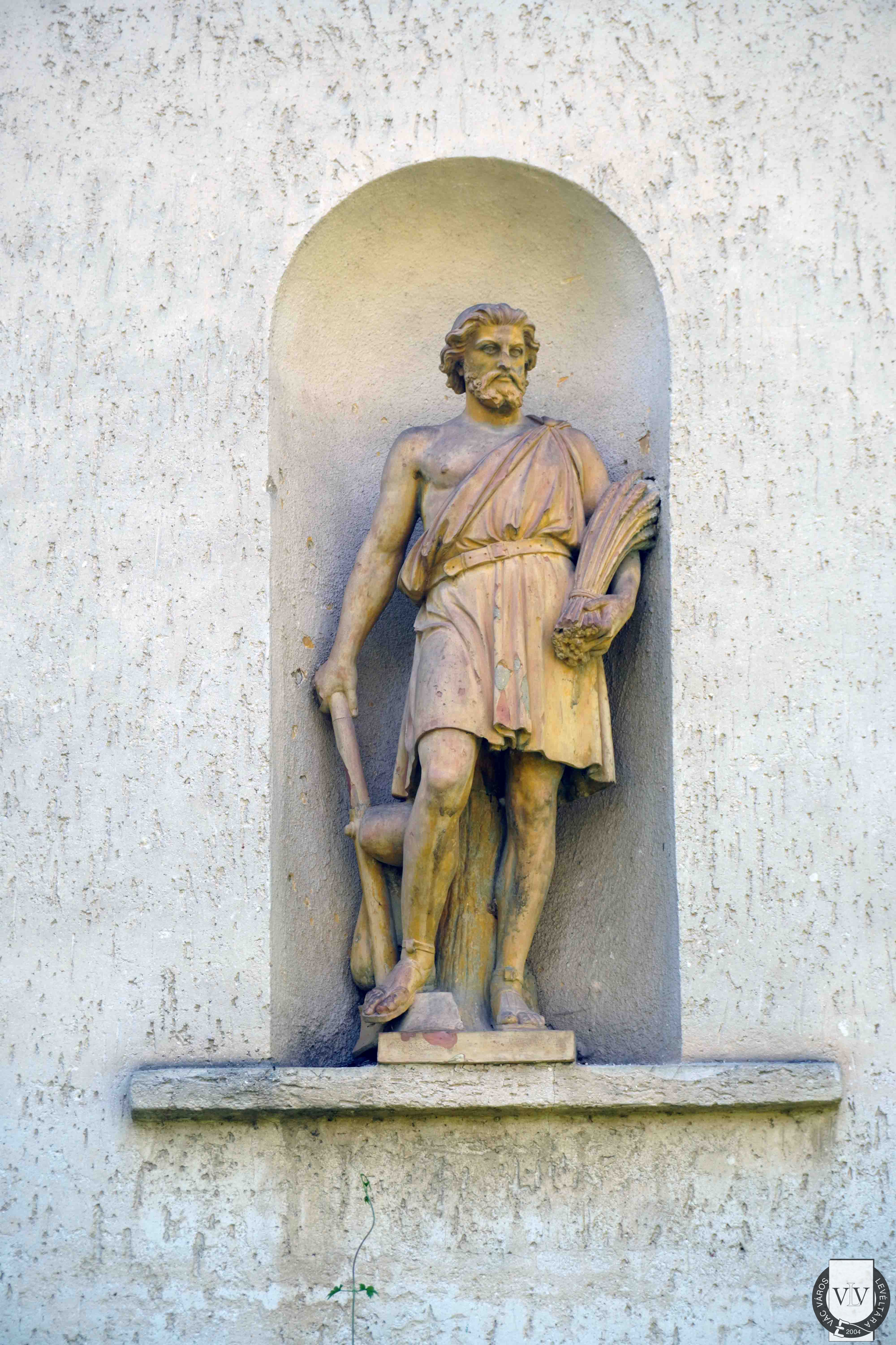 A kastély termékenységet, a mezőgazdaságot ábrázoló homlokzati szobra, 2023