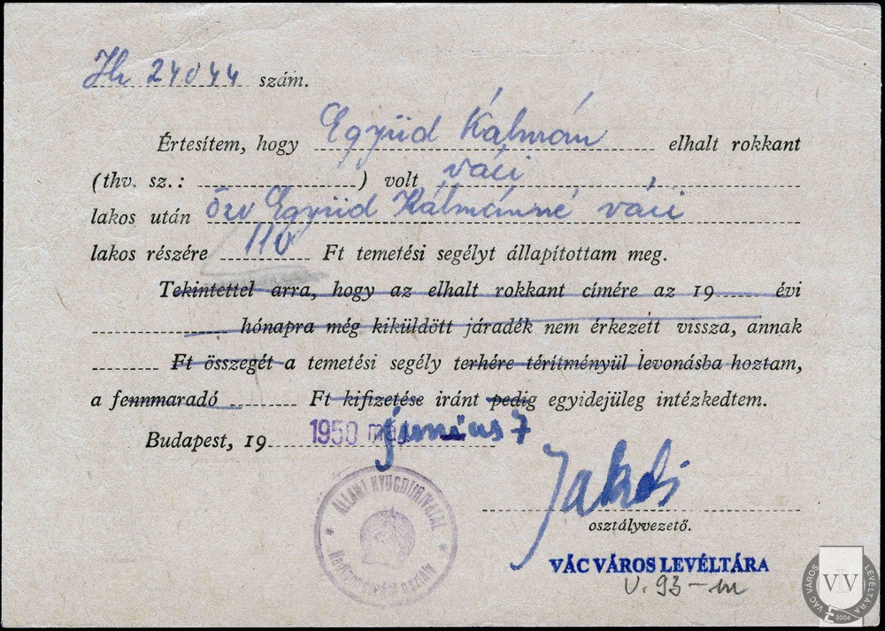 | Együd Kálmán | Ifj. Együd Kálmán hadisegélye | Nyári Mária | 56 éves (1945-ben) | Kálmán, Vác, 1913. nov. 17. | Vác, Horthy M. út 47. | VVL V. 93-c 7830/1945. |