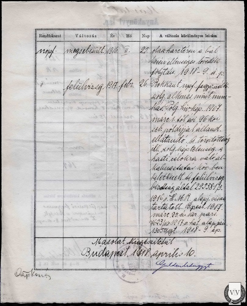 | Nagy József | Nagy István | (Csankó) Mészáros Teréz | Vác (Pest-Pilis-Solt-Kiskun m.) | 1880. márc. 5. | r. k. | olaz harctér, 1915. máj. 9-1915. aug. 17., 1915. dec. 6-1917. márc. 15. | 6 elemi, Váci Rokkantiskola (1918-ban) | betonmunkás (1919-ben); gyári munkás 1946-ban, Elsõ Magyar Szövõ- és Kötõgyár Rt. | 1914. dec. 10. felavatás; 1915. márc. 15. tényleges fegyveres szolgálat | m. kir. budapesti 1. gye., 1. és 3. század | népfelkelõ honvéd | 1914. dec. 10. felavatás; 1915. márc 15. tényleges szolgálat; 1914-Vác, 1918. nov. leszerelés; m. kir. budapesti 1. gye.: 1915. márc. 15-1917. febr. 26., összesen: 1 év, 11 hónap, 12 nap + 3 háborús év, mindösszesen: 4 év, 11 hónap, 12 nap | 1915. júl. 11. Olaszországban az állásban srapnel által; másodszor 1916. febr. 25. Olaszországban támadáskor bal alkaron ellenséges puskagolyó által; bal nervus medianus részleges hûdése lövési sérülés következtében; elõször kórházban: Varasd (1 hónap), Váci vöröskeresztes hadikórház (2 hónap), utána csapattesthez; másodszor kórházban: 1917. márc. 15. Székesfehérvár (2 hét), Váci vöröskeresztes hadikórház (2,5 hónap), Pestújhelyi munkáskórházban (4 hónap), 1917. jan. 25.- Budapest, Greshem palota (4 hónap); mindenféle kat. szolgálatra alkalmatlan | 25%, 30%, 50% | legénységi, IV., majd III. járadékosztály | Vöröskatona nem volt | Nagy József hadigondozása | Szabados Rozália | 1881. szept. 4. | 1902. aug. 16. | József, 1902; János, 1907. jan. 28.; István, 1911. febr. 17. | Váci Rokkantiskola (1918-ban); Vác, Galcsek u. 3. (1947-ben) | VVL V. 93-m | ||||||||||