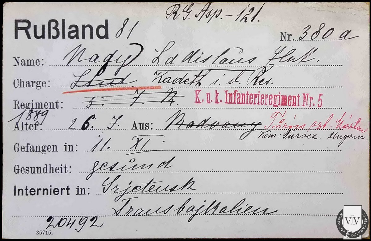 Nagy László (Ladislaus) Elek Turócszentmárton (Turóc m.) 1889. júl. 26. cs. és kir. szatmárnémeti 5. gye. tartalékos hadapródjelölt Oroszország, Bajkálon túli terület, Szretyenszk [1914.] nov. 11. egészséges Nagy László Elek hadifogoly nyilvántartólapja HL adatközlése, AT-ÖeStA/KA Nagy László Elek hadifogoly nyilvántartólapja, 380a.
